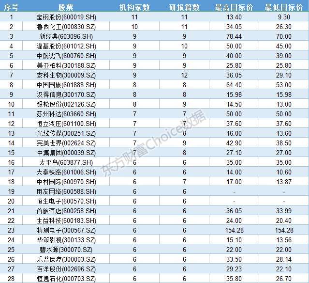 共有28家上市公司获得机构关注6次以上,其中有10份关于宝钢股份的研报。申万宏源认为,宝武合并后通过降本增效和协同效应,未来将持续改善原武钢资产的盈利能力,湛江基地全面投产,先进产能成本优势突出。宝钢股份是钢铁行业内少有的有内生量价齐升改善空间的公司,看好公司中长期发展,上调盈利预测。